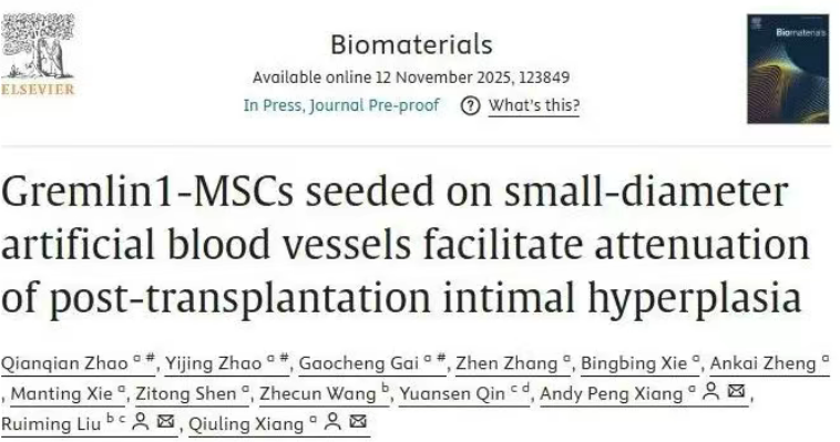 中山大学向秋玲/刘瑞明/项鹏合作揭示Gremlin1修饰间充质干细胞提高小口径静电纺丝聚氨酯人工血管移植通畅率