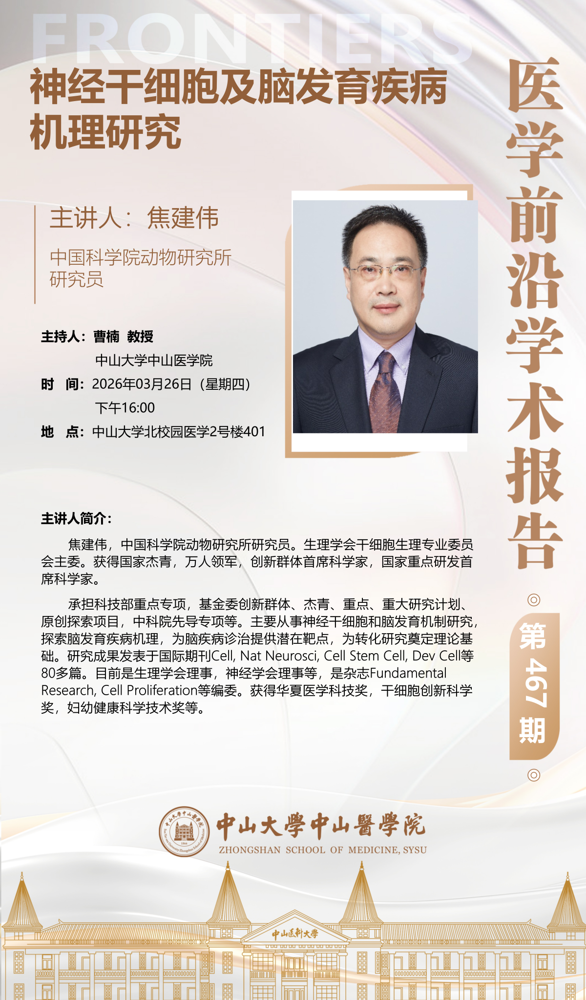 导航痕迹 博彩公司排名 科学研究 学术讲座 医学前沿学术报告第467期 科学研究 科研通知 学术讲座 科研平台 办理指引 医学前沿学术报告第467期 神经干细胞及脑发育疾病机理研究 发布人:何军芳 发布日期:2026-03-24